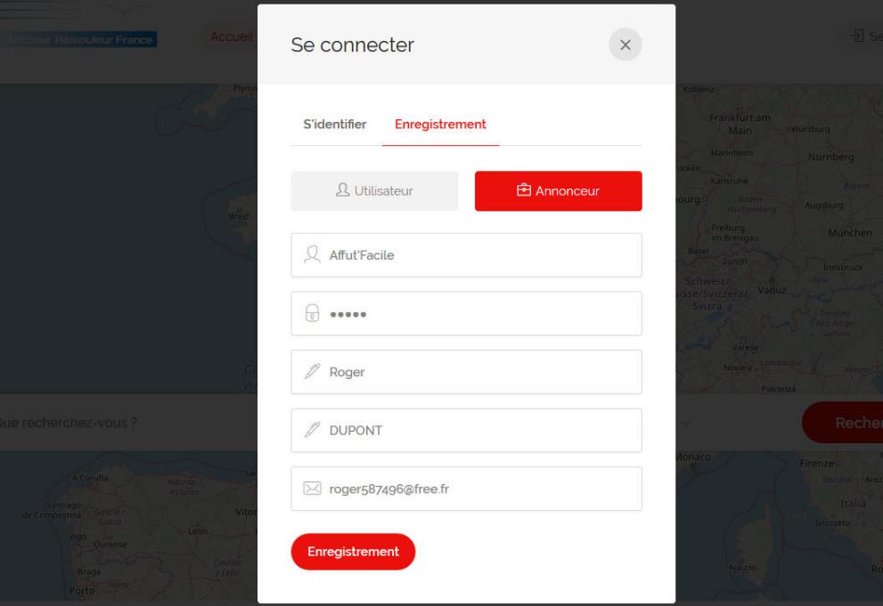 3- Renseigner les zones (Nom Entreprise, Mot de passe, Prénom, NOM, adresse mail) puis cliquer sur "Enregistrement"